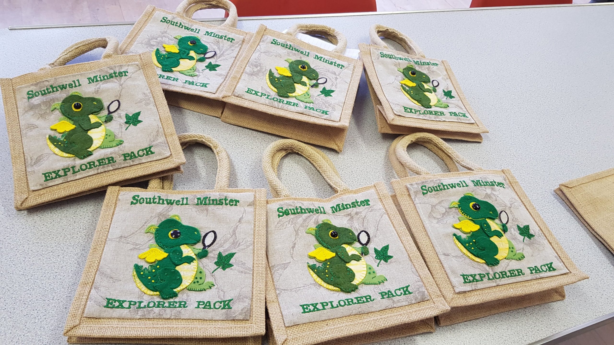 Right: set of small “explorer pack” bags with an embroidered applique dragon, designed and made by the guild for young visitors to the Minster