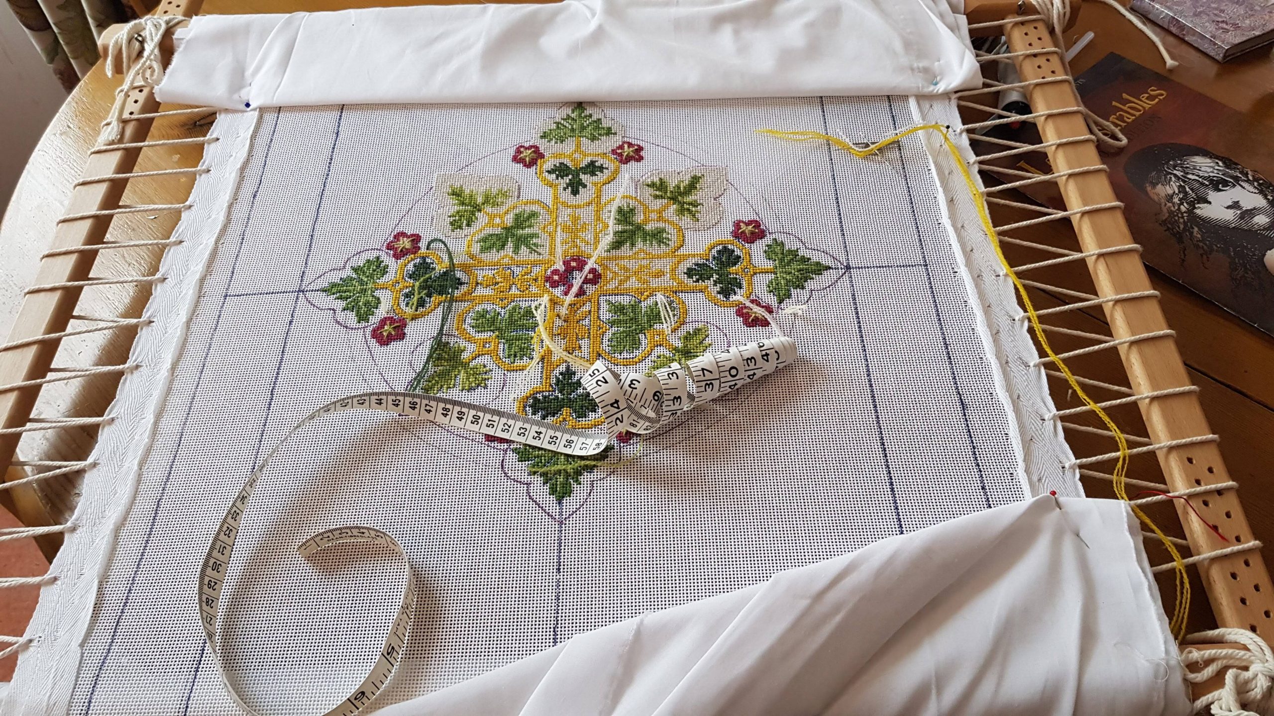 “After finishing my Certificate in technical hand embroidery from the Royal School of Needlework, I was looking for a new outlet for my skills. I am particularly interested in church embroidery, vestment making, and textile conservation. Emma got in touch after seeing my work online, and we discovered that I lived close enough to join the Needlework Guild. I was delighted to find such a friendly and talented group working in such a beautiful setting. My current piece is a cushion for the choir stalls. Emma encouraged me to come up with my own design inspired by the work of Pugin and some of the beautiful botanical wood carvings in the quire” A.F.